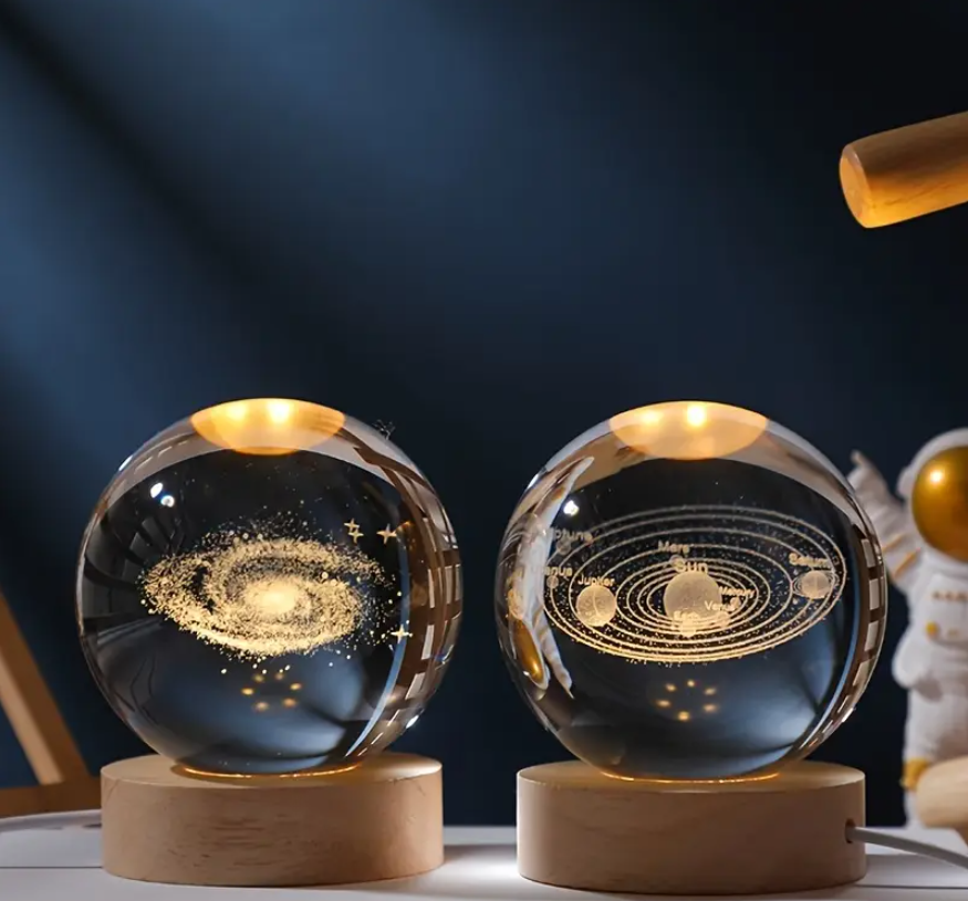 كرة كريستالية تحوي بداخلها مجسمًا ثلاثي الأبعاد للقمر والسماء، مزودة بكابل شحن وتتميز بقاعدة خشبية، يمكن استخدامها كمصباح ليلي ذو تصميم مبتكر، مناسبة للاستخدام كديكور للمكاتب أو كهدية للأعياد والمناسبات، وتأتي كل منها بشكل مختلف.